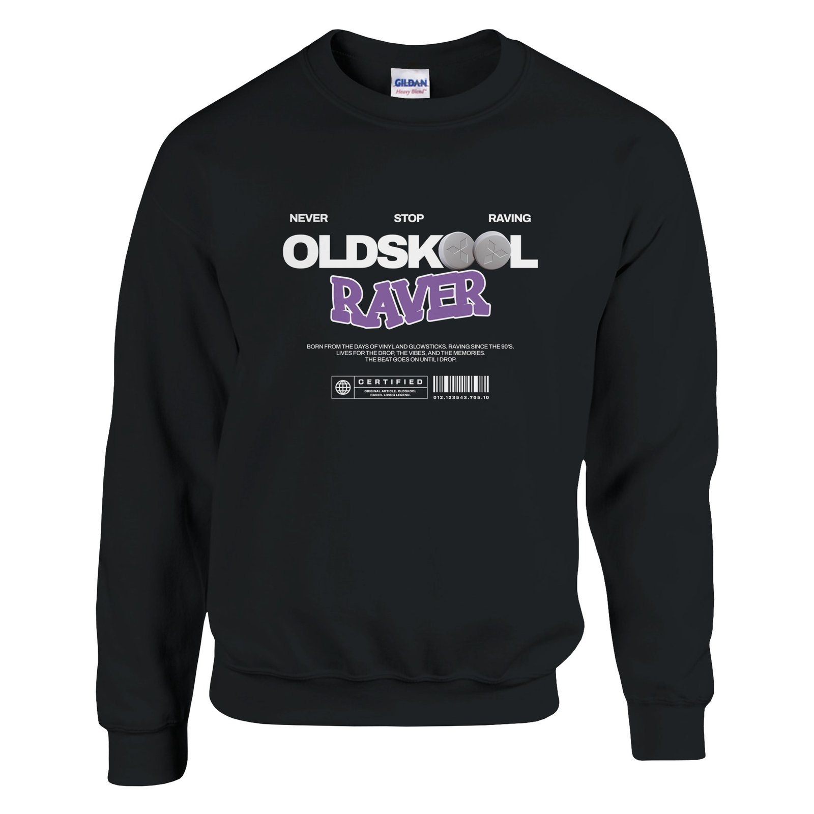 The Oldskool Raver Sweatshirt, for clubbers, old school ravers and dancefloor legends of all electronic music genres.
