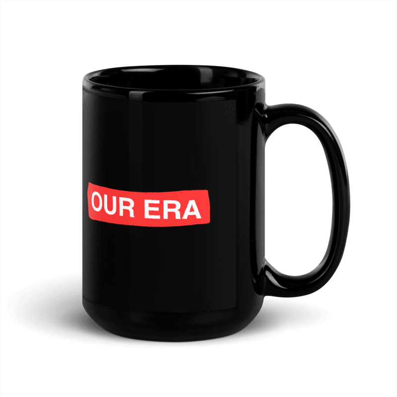 Whether you're drinking your morning coffee, evening tea, or something in between - this Our Era Black Mug's for you! It's sturdy and glossy with a vivid print that'll withstand the microwave and dishwasher.